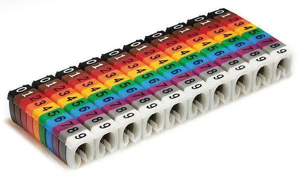Маркер кабельный   0-9 (100шт)  (от 2 до 3 мм)   предназначен для маркировки проводов и кабеля. Изготавливается из эластичного и негорючего ПВХ,с отверстием для проводника. Облегчают идентификацию проводов в процессе монтажа и демонтажа проводки. Рабочая температура 85°C. Благодаря специальной эластичной форме каждый маркер надежно фиксируется  на проводах с сечением в диапазоне (от 2 до 3 мм). Каждая цифра имеет свой цвет: черный, коричневый, красный, оранжевый, желтый, зеленый, синий, фиолетовый, серый, белый. Маркеры соединяются между собой с помощью зубцов и пазов.